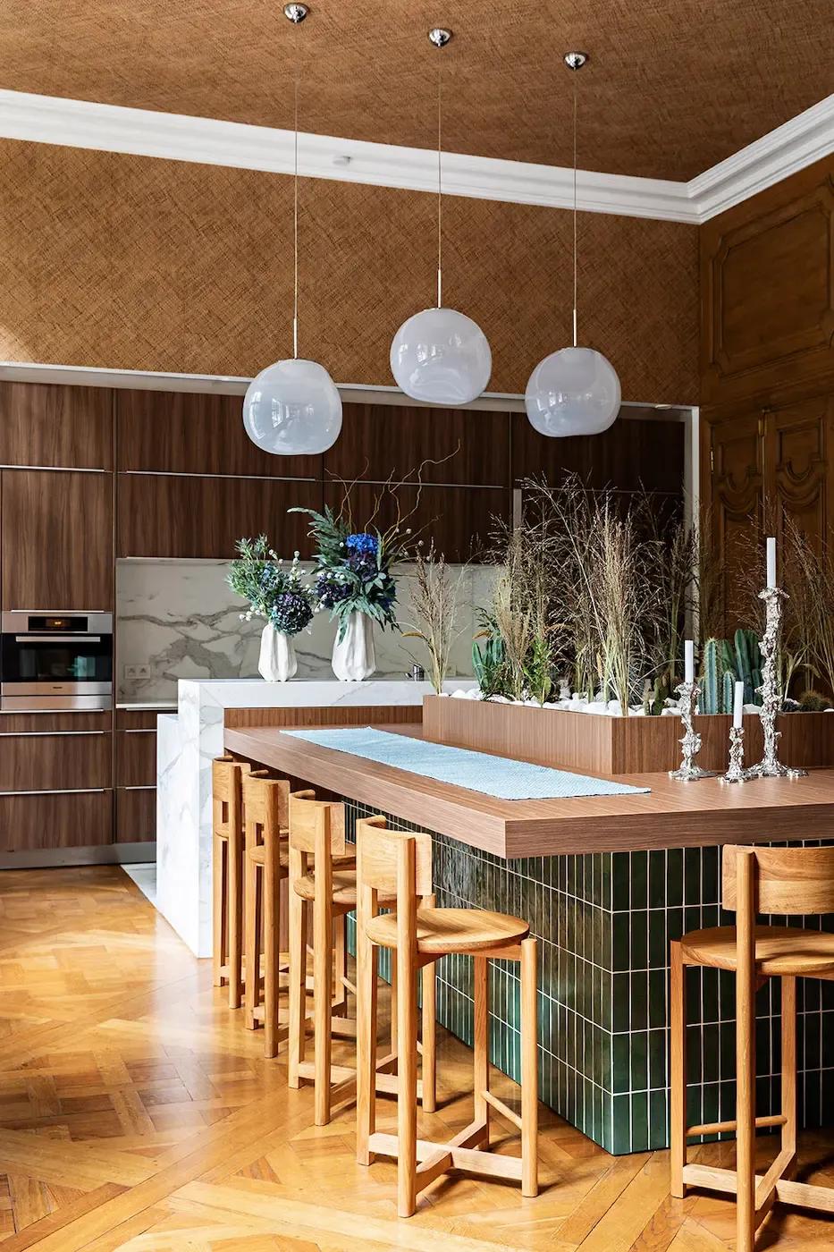 Le Living Room attenant, plus contemplatif, propose une exposition d’images d’archives, d’éléments culturels français et américains exposés sur un large linéaire décoratif. Puis se succèdent l’Informal Kitchen et la Dining Room, proposant des espaces de réception pensés et aménagés avec des pièces conçues sur mesure, notamment l’immense table dînatoire en bois massif, imaginée et réalisée pour l’occasion.